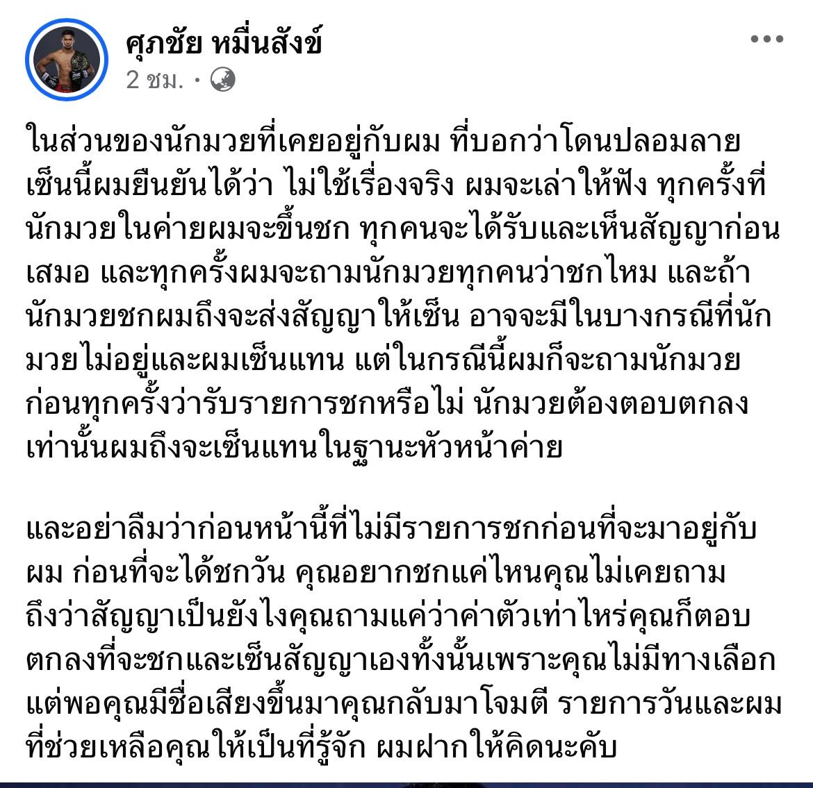 Superbon posted regarding Khunsuek, whom he once managed, affirming he never forged any signatures.