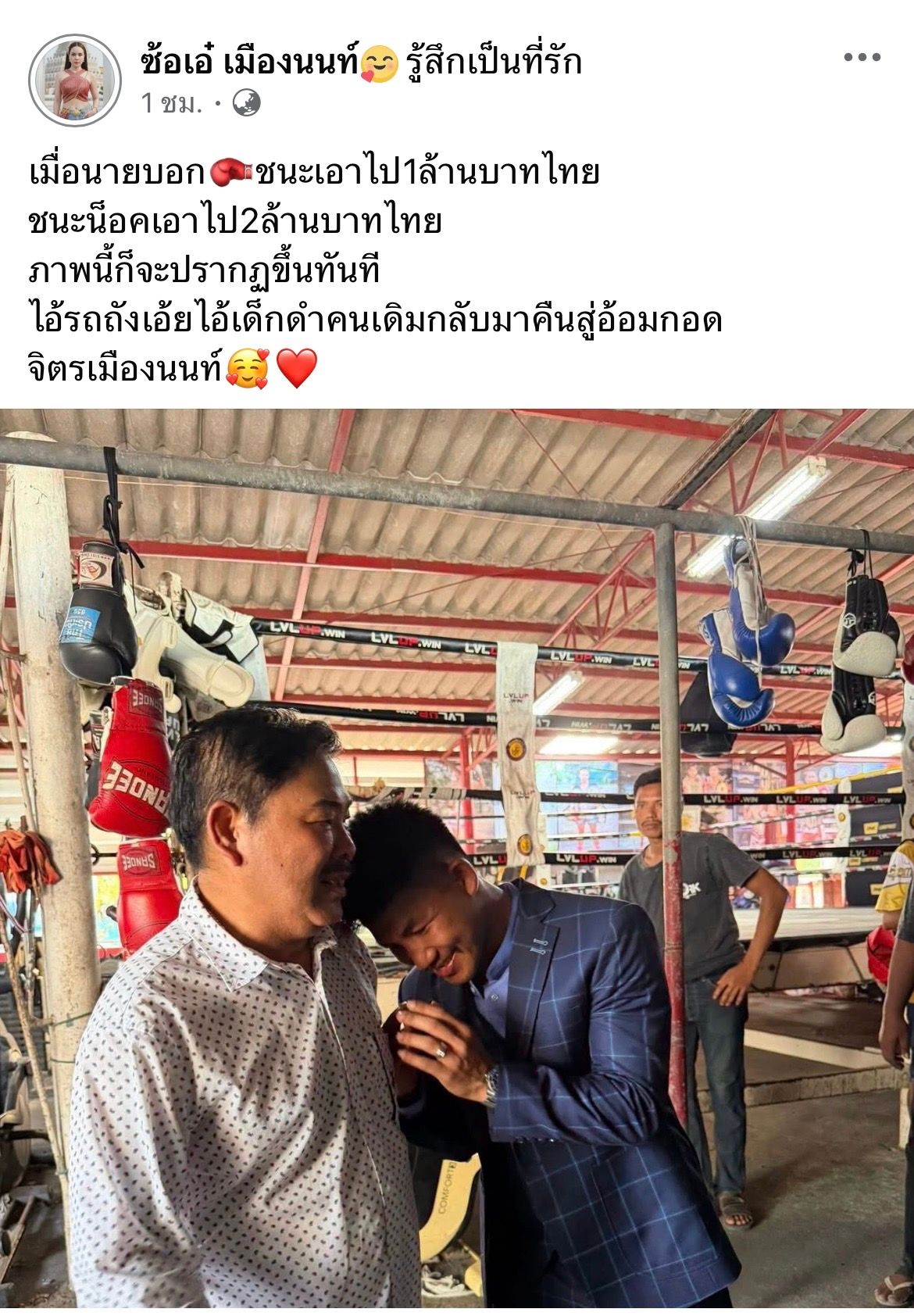 Sor Ae posted on Facebook a photo of Rodtang embracing Mr. Somjit with the caption, “When he said, ‘Win and take 1 million baht, win by knockout and take 2 million baht,’ this image immediately appeared. Rodtang, the same dark-skinned boy, has returned to the embrace of Jitmuangnon.”