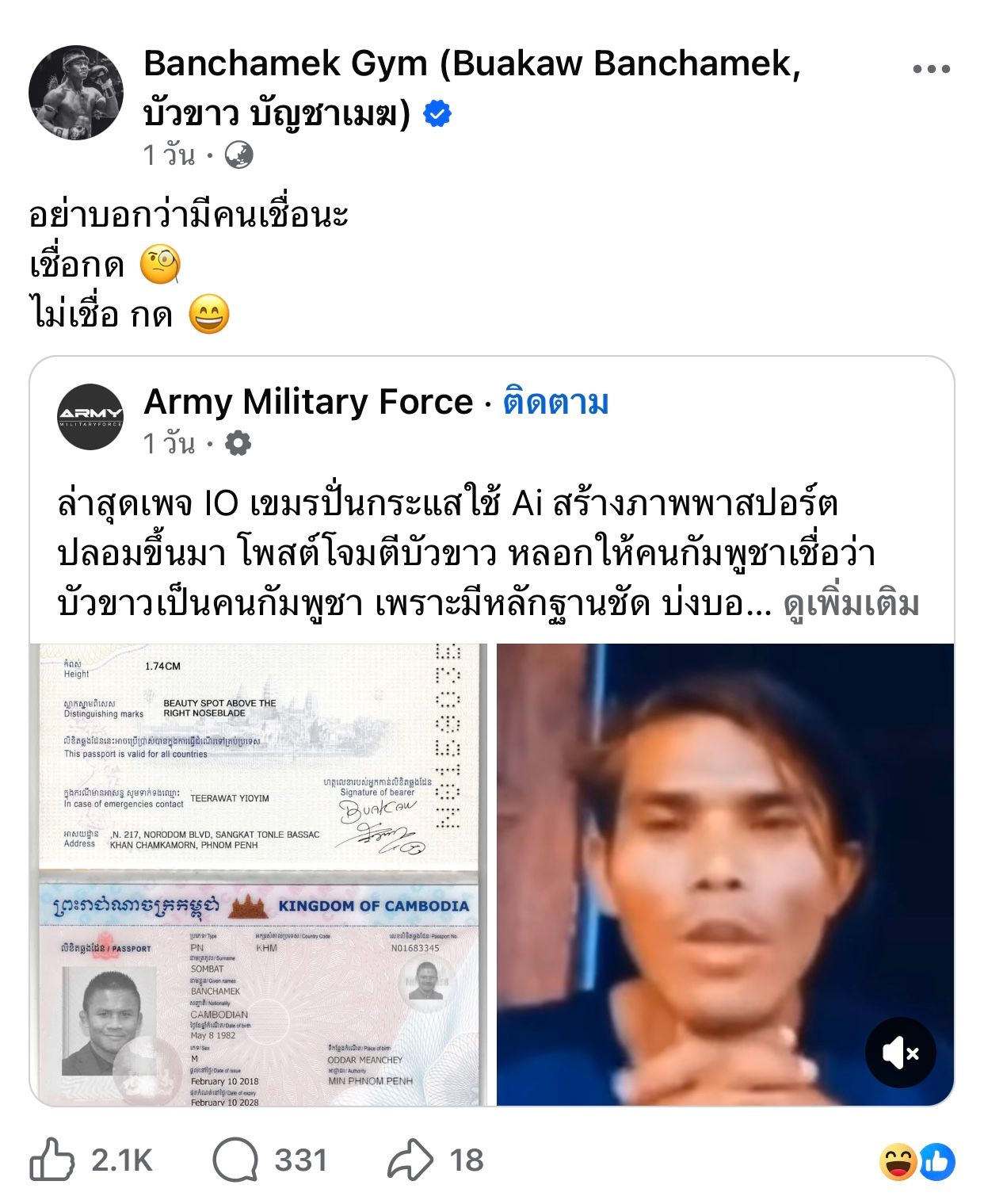 On 22 Dec 2025 GMT+7, the Facebook page Army Military Force posted that the Cambodian IO page stirred controversy by using AI to create a fake passport image attacking Buakaw. They falsely tried to convince Cambodians that Buakaw is Cambodian, citing alleged evidence showing he holds a special Cambodian passport, claiming Buakaw is not Thai. Banchamek Gym (Buakaw Banchamek) was mentioned.