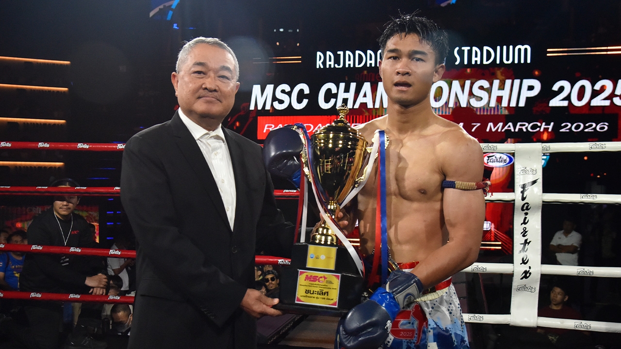 The Muay Thai competition “MSC Championship 2025” (MSC2025), organized by the Muay Thai Sports Committee of the Sports Authority of Thailand (SAT), reached its final round at Rajadamnern Boxing Stadium on 7 March. The event drew a large crowd of boxing fans. Distinguished guests included Mr. Somchai Poolsawas, Chairman of the organizing committee; Ms. Prodpran Samanmit, Deputy Governor for Professional Sports and Muay Thai at SAT; Mr. Pitsanu Laichapit, former President of the National Sports University; Mr. Natthapon Antarsen, Director of the Muay Thai Sports Committee at SAT; and Mr. Suwit Kerdbamrung, Director of the Anti-Doping Control Office at SAT. They presented awards to the winners and runners-up amid enthusiastic spectators at Rajadamnern Stadium.