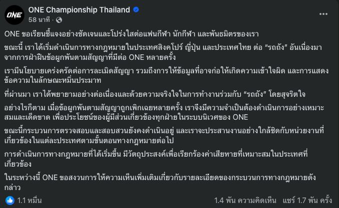 "We have initiated legal action in Singapore, Japan, and Thailand against 'Rodtang' due to repeated violations of contractual obligations with ONE."