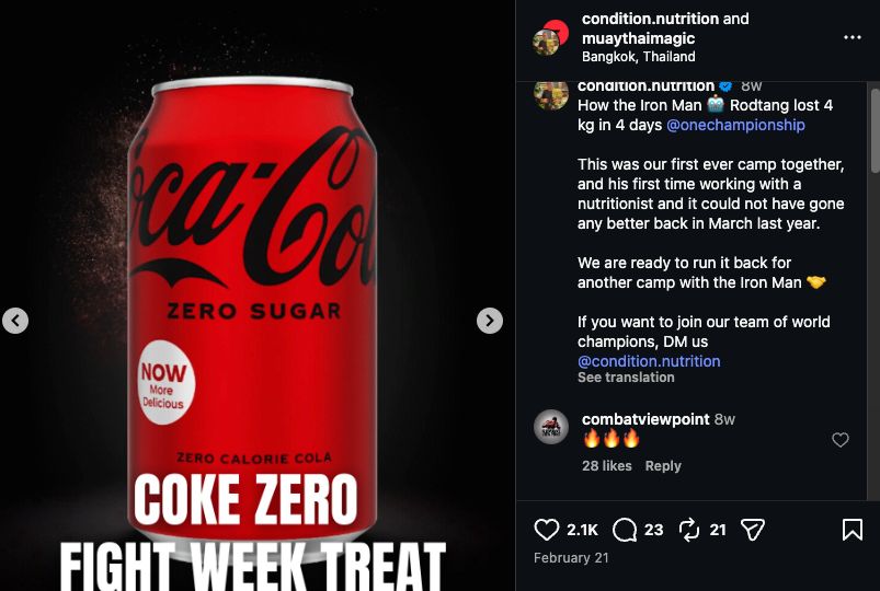 Sugar-free soda was given as a reward during the week before the fight.