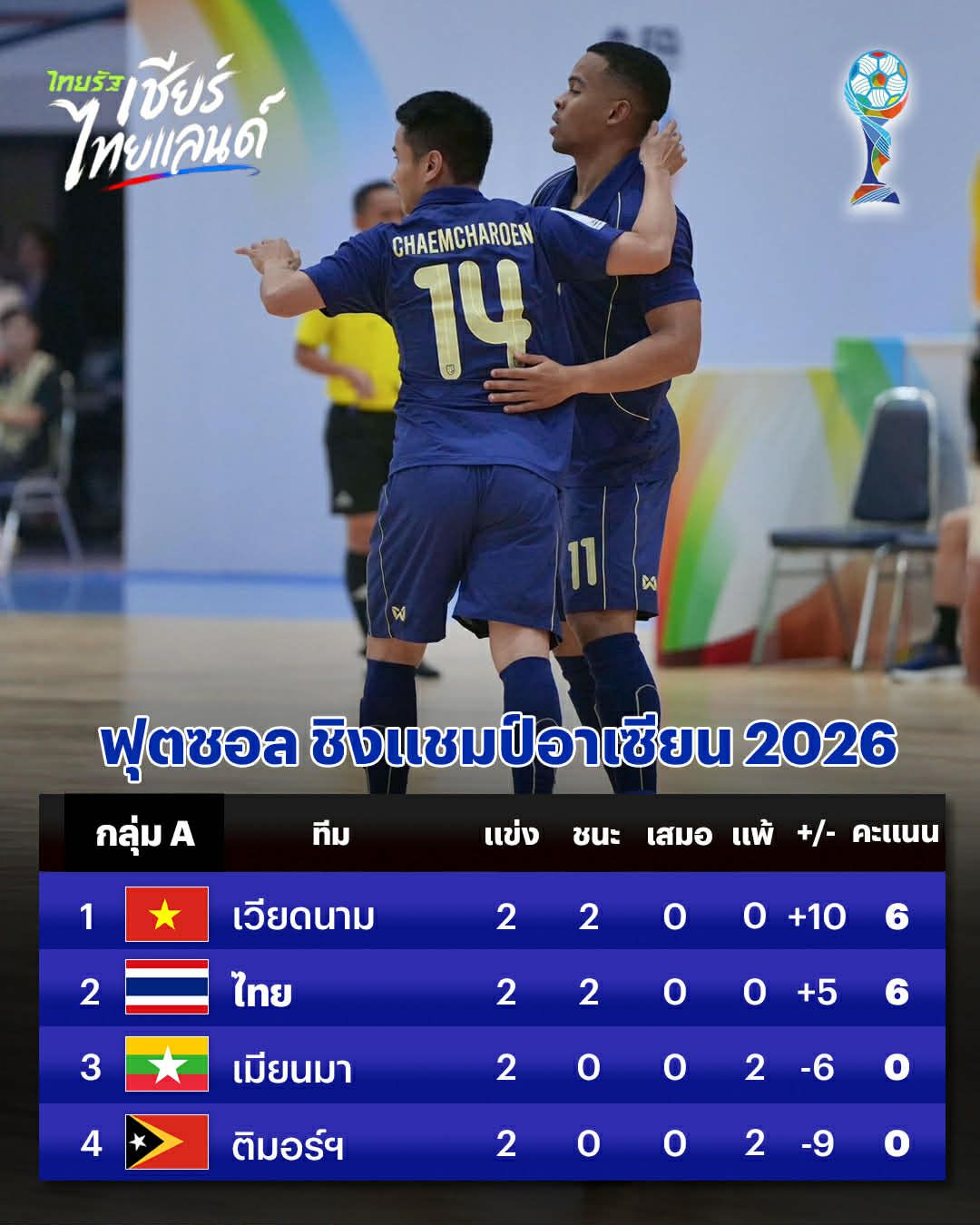 On 7 Apr 2026 GMT+7, the standings for the ASEAN Futsal Championship 2026 were updated following the conclusion of Group A's second matchday. The "War Elephants"—Thailand's national futsal team—secured a 2-0 victory over Myanmar's national futsal team, earning 6 points from 2 matches. They currently hold 2nd place in the standings and have successfully advanced to the semifinals.