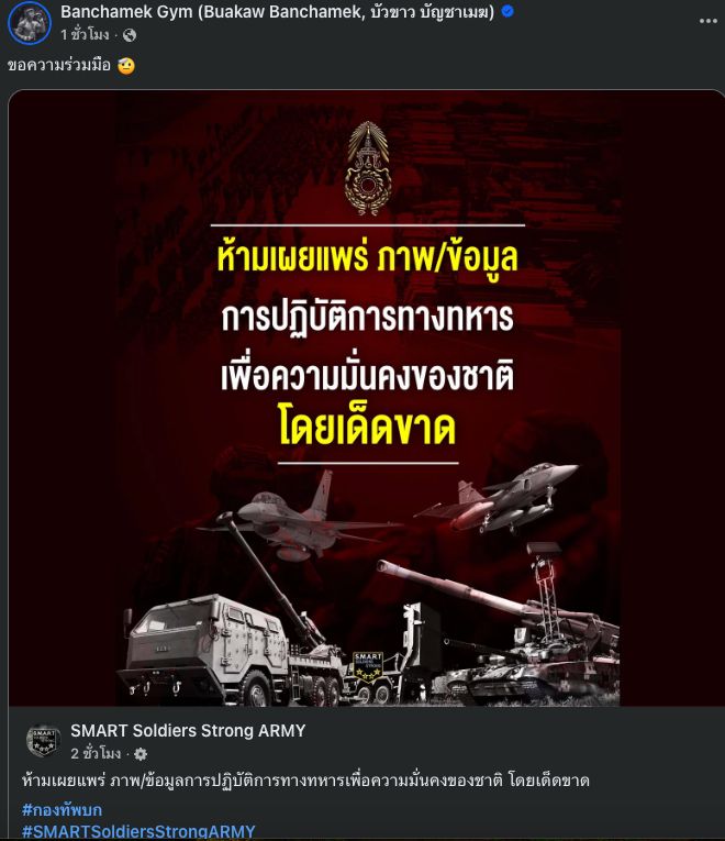 Additionally, Buakaw shared information from the Royal Thai Army requesting cooperation during the Thai-Cambodian border incident, stating, "Strictly prohibit the dissemination of photos or information about military operations for national security."