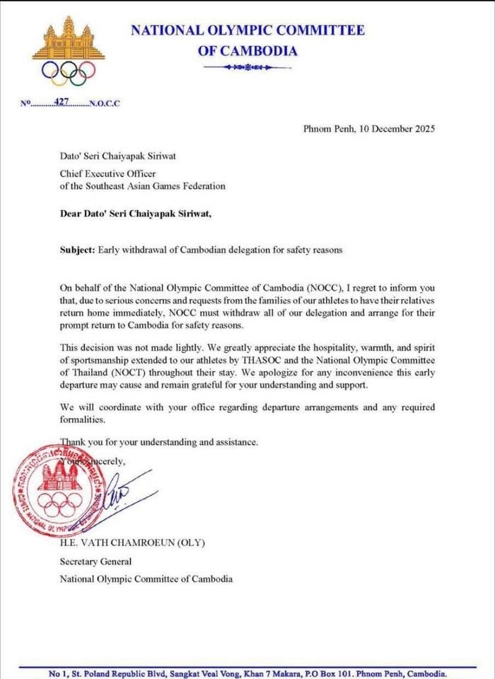 In the letter addressed to Major Ekachai Sirivat, Vice President of the National Olympic Committee of Thailand, the Cambodian side stated that the decision was difficult but made urgently in response to requests from athletes' families who wanted them to return home immediately for their safety.