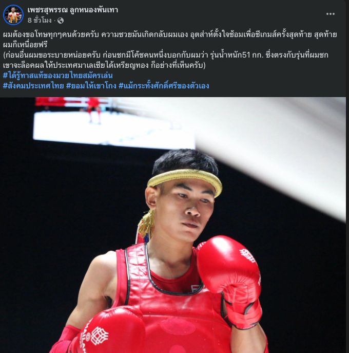 "I'm done with the national team. I will switch to professional Muay Thai. I want to apologize to Thai sports fans for not achieving the result. I gave it my all."