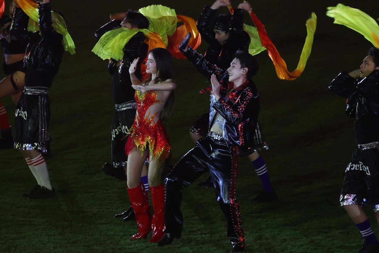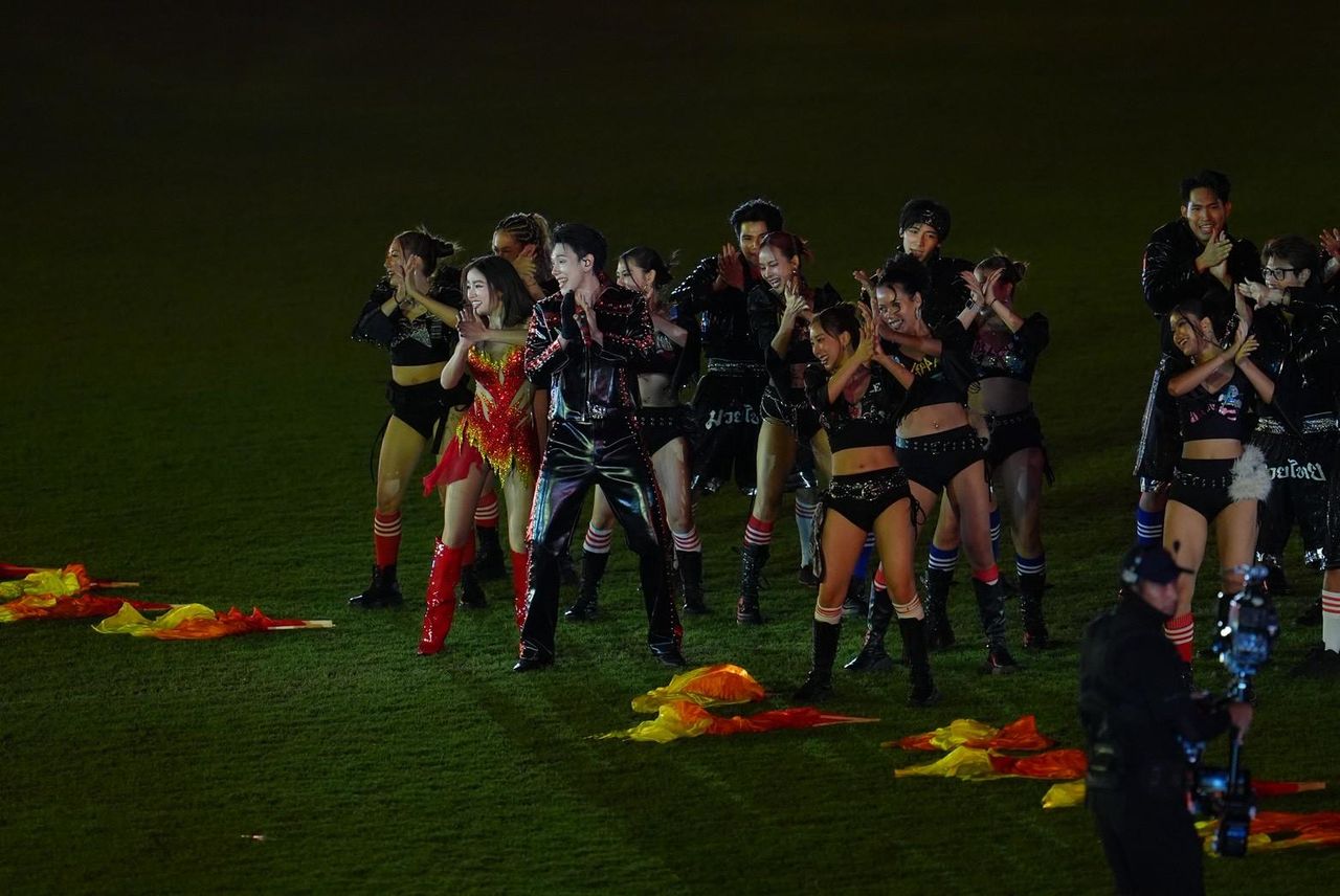 Next was the performance titled "The Sound of Whistle… Echoes of Competition," featuring the whistle sound marking the start and end of competitions. Singers Tah Woo (Pittaya Saechua) and Kratae Rsiam (Tra Boonyaleang) added vibrancy with the song "Strong Love," as well as performing their own hits "Melting" and "Bangkok City."