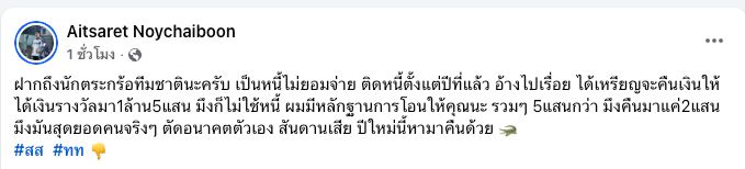 Isaret Noi-jai-boon posted a debt reminder to a Thai national sepak takraw player for more than 300,000 baht, revealing he lent the money since last year.