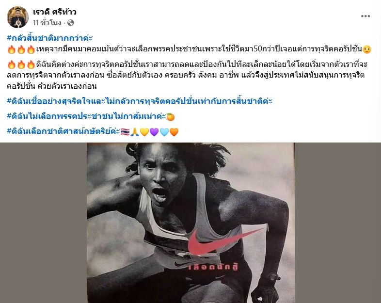 Rewadee posted on Facebook, saying, "I fear the collapse of the nation more, prompted by someone commenting that they would vote for the People's Party because in their 50-plus years they've only encountered corruption and fraud."