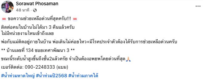 Sarawat Phosaman posted on Facebook urgently seeking help after being unable to contact his family for three consecutive days following severe flooding.
