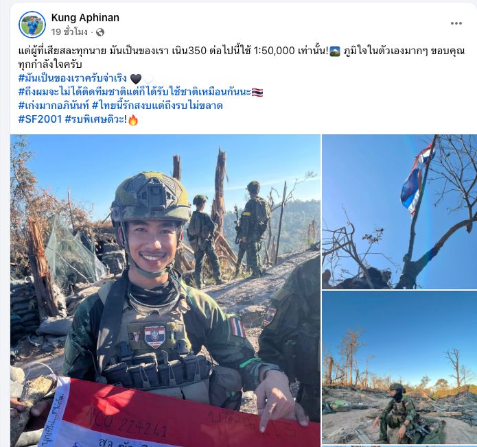Staff Sergeant Aphinan posted on Facebook: “To all who sacrificed, Hill 350 is ours. From now on, it will only be represented at 1:50,000 scale! I’m very proud of myself. Thank you all for your support. #ItIsOursSergeantRerng #EvenThoughINeverMadeTheNationalTeamIHaveServedTheNationToo #GreatJobAphinan #ThailandLovesPeaceButIsBraveInBattle #SF2001 #SpecialForcesDiwa!”