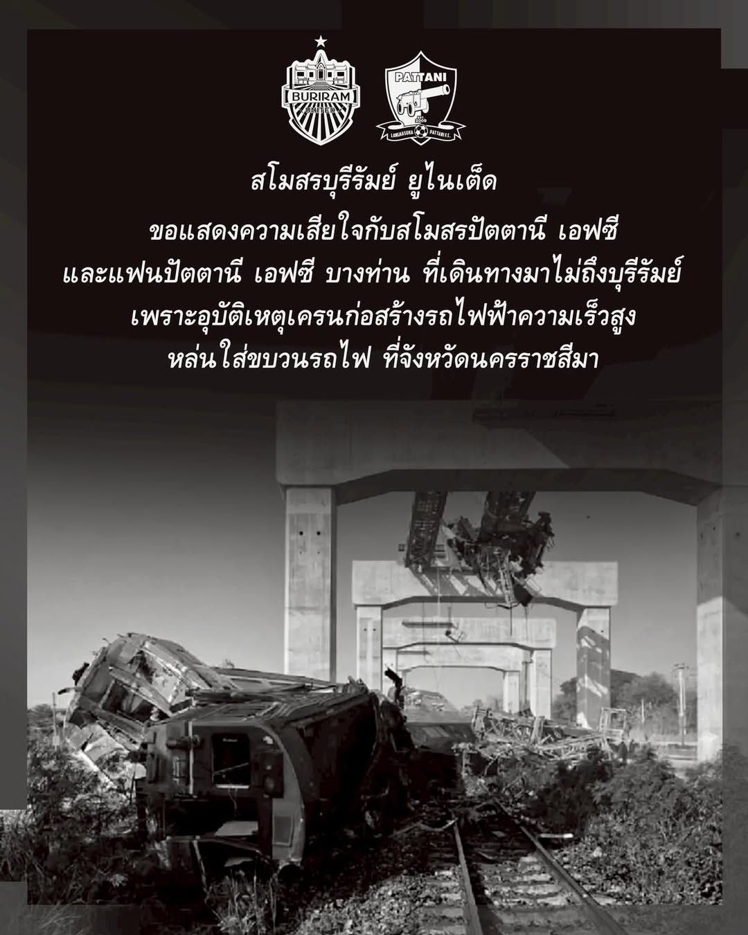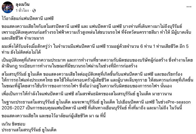 Buriram United Football Club extends condolences to Pattani FC fans involved in this tragedy and urges the State Railway of Thailand to provide proper compensation to the families of the deceased and all injured, as this occurred while passengers were using railway services, which falls under the responsibility of the State Railway.