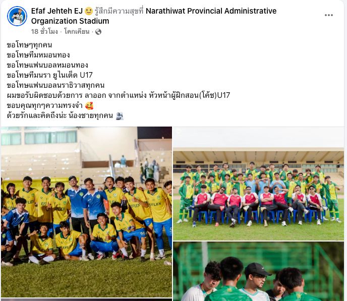 "My apologies to everyone. I apologize to the Mon Thong team and their fans, to Nara United U17, and to all the fans in Narathiwat. I take responsibility by resigning from my position as head coach of the U17 team. Thank you for all the memories. With love and fondness to all my younger brothers."