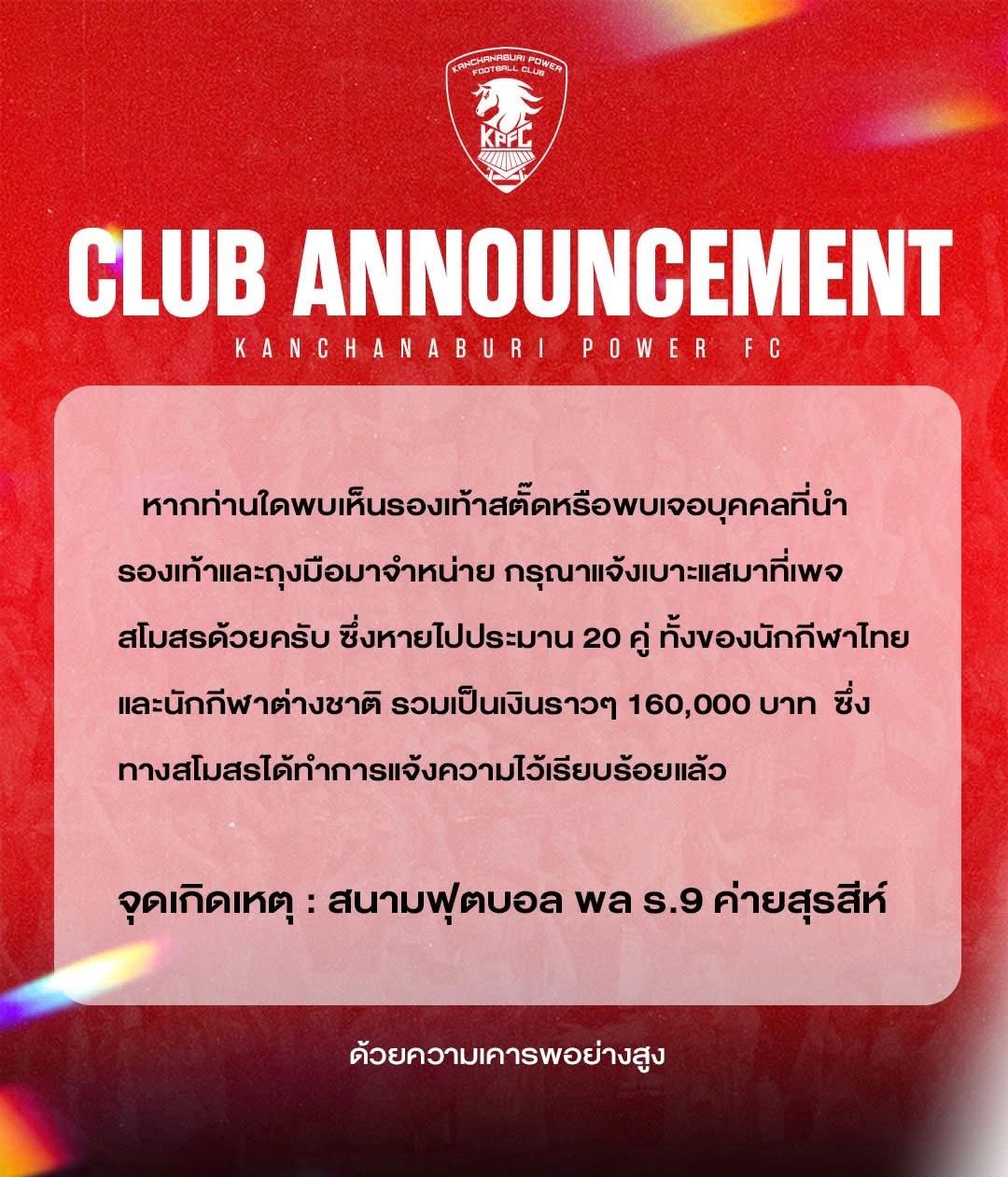 "If anyone sees football boots or encounters anyone selling shoes and gloves, please report any clues to the club's page. About 20 pairs have gone missing, belonging to both Thai and foreign players, totaling around 160,000 baht. The club has already filed a police report."