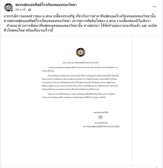 “Regarding Coach Sakol Kliangprasert's announcement about leaving the Mon Thong Wittaya school football team, the Alumni Football Club respects his decision. All good things must come to an end.”