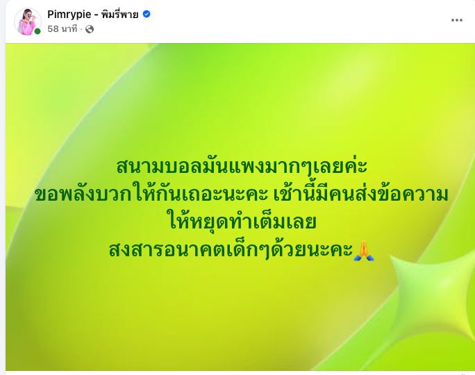 Pimrypie posted on Facebook, "The football field is very expensive. Let's share positive energy, please. This morning, many messages urged me to stop building it. I feel sorry for the children's future."