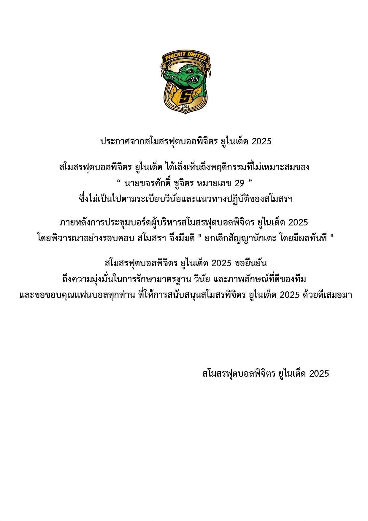 Recently, Phichit United club confirmed the immediate termination of Khajornsak’s contract, effective immediately, due to his unsportsmanlike conduct.