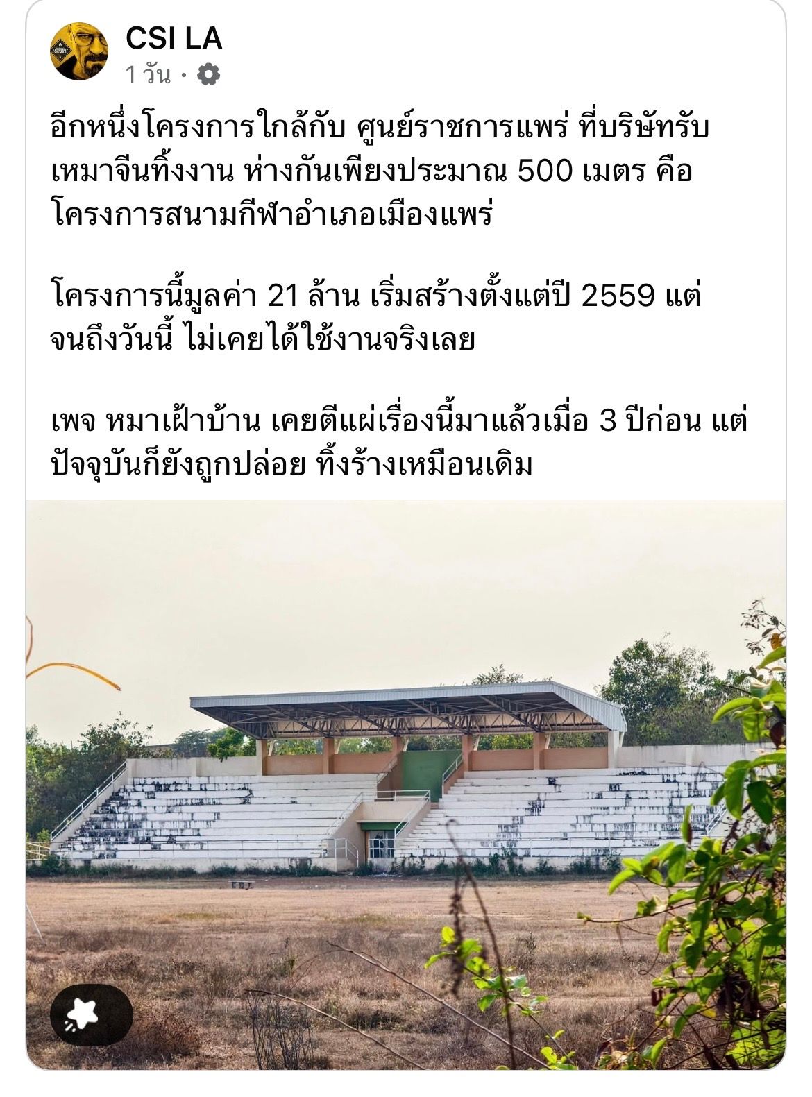 The CSI LA page posted: “Another project near the Phrae Government Center, about 500 meters away, is the Muang Phrae District Sports Stadium. This project, valued at 21 million baht, started construction in 2016 but has never been put to actual use. The Facebook page 'Dog Guard' exposed this issue three years ago, but it is still abandoned today.”