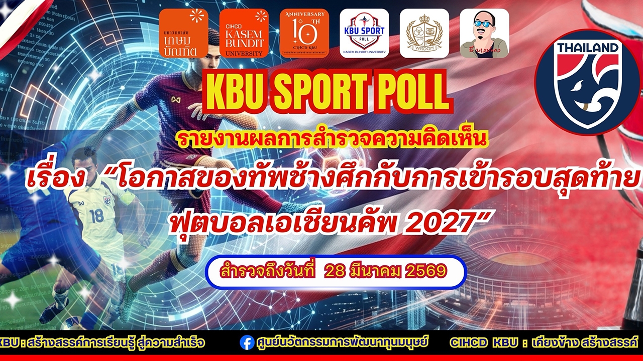 With the Thai senior national football team set to play their final Asian Cup 2027 qualifier against Turkmenistan on 31 March 2026 at Rajamangala National Stadium, KBU SPORT POLL, conducted by the Human Capital Development Innovation Center at Kasem Bundit University in collaboration with the Institute of Sports Management for Sports Organizations (WISDOM) and the B Bangpakong Facebook page, surveyed public opinion on "The Thai National Team's Chances of Reaching the Final Round of the 2027 Asian Cup." The survey was conducted online and by telephone interviews from 26-28 March 2026, with a sample of 1,127 people aged 18 and over from all regions nationwide. The sample included 685 males (60.79%), 324 females (28.76%), and 116 LGBTQIA+ individuals (10.47%). Overall analysis found that