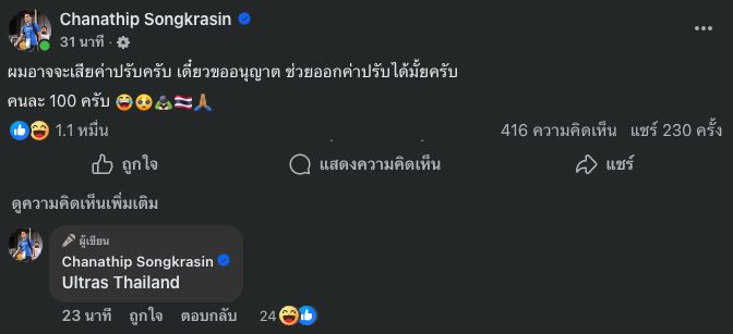 Most recently, Jeerawat posted on his personal social media about the flare incident: "I might have to pay a fine. May I ask for permission—can you help cover the fine? Just 100 baht each."