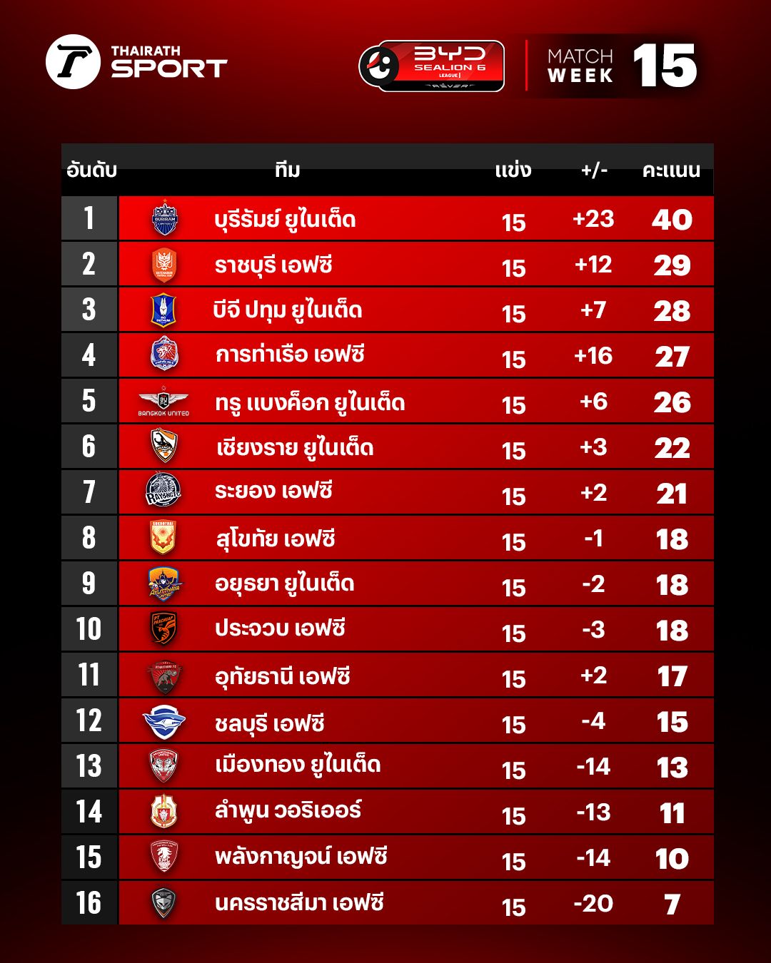 Buriram United continues to demonstrate superiority, firmly holding the top spot with 40 points, leading second-place Ratchaburi FC by 11 points, creating a significant gap at the top.