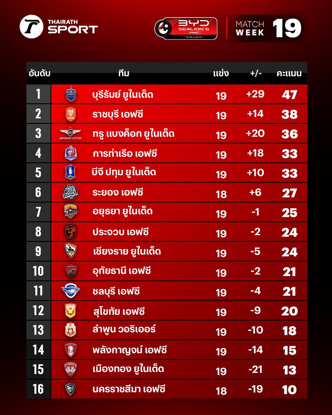 Summary of the 2025-26 Thai League standings after the conclusion of matchday 19. The points table reflects the current team rankings.