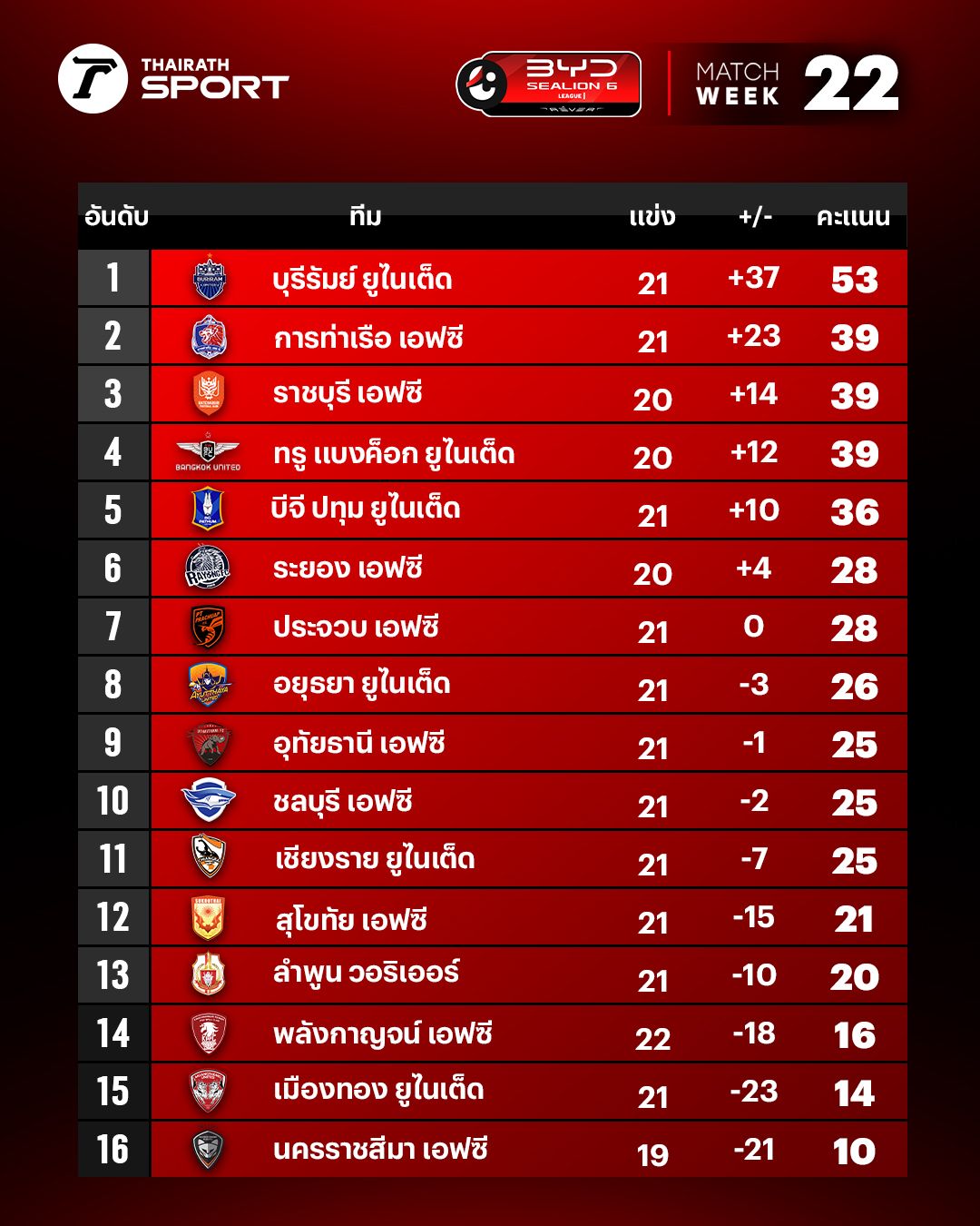 At the end of week 22, at the top, Buriram United still leads by a large 14-point margin. Meanwhile, Ratchaburi FC, whose match against Lamphun Warriors was postponed, has been overtaken by Port FC to second place. True Bangkok United in fourth has caught up on points, creating a three-way tie.