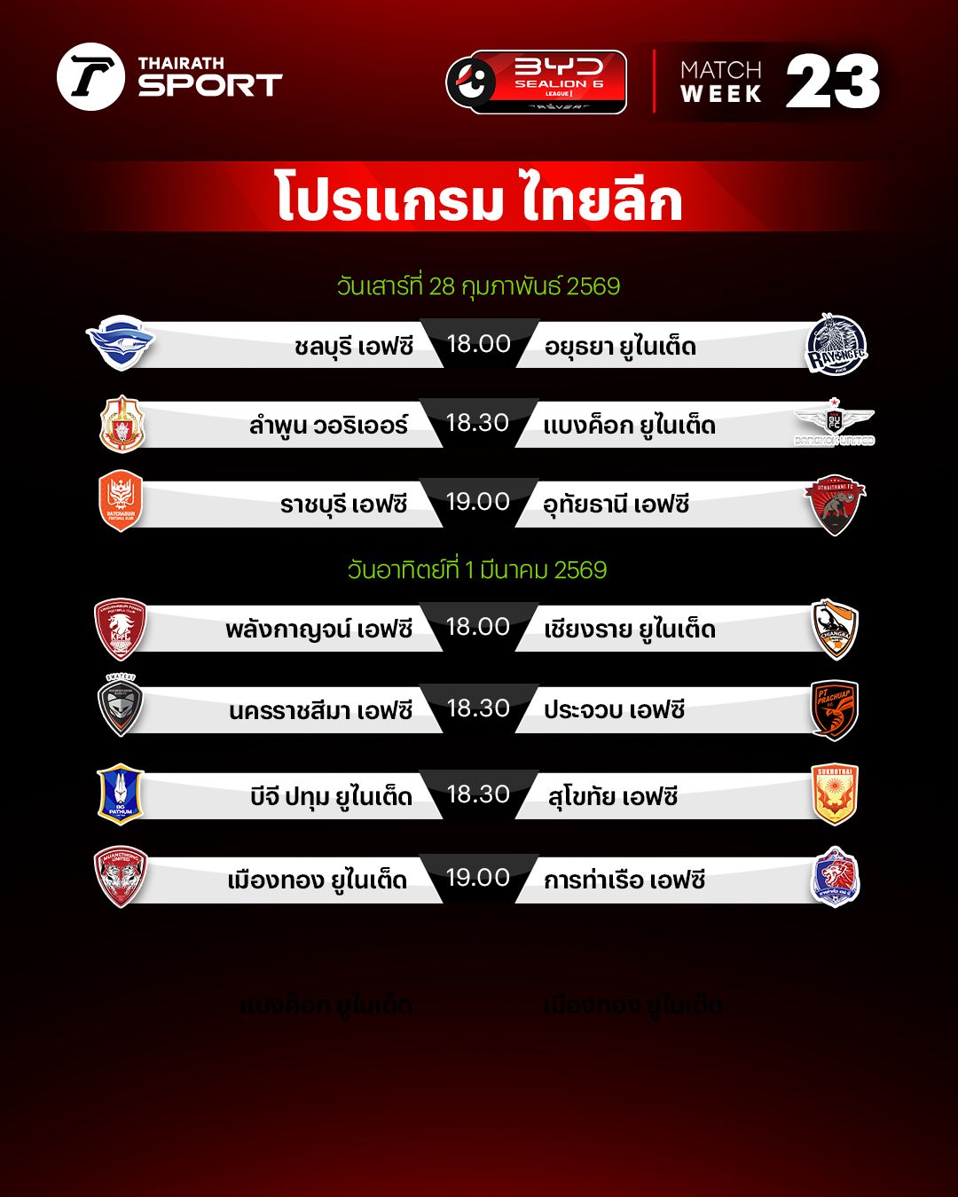 The Thai League 1 football schedule for the 2025/26 season, matchday 23, on 28 February - 1 March 2026, will be broadcast live on Ais Play and MonoMax.