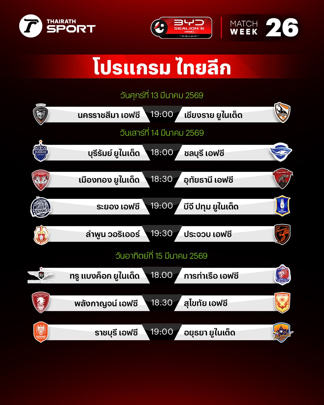 Thai League 1 football schedule for the 2025/26 season, round 26, on 13-15 March 2026, broadcast live on Ais Play and MonoMax.