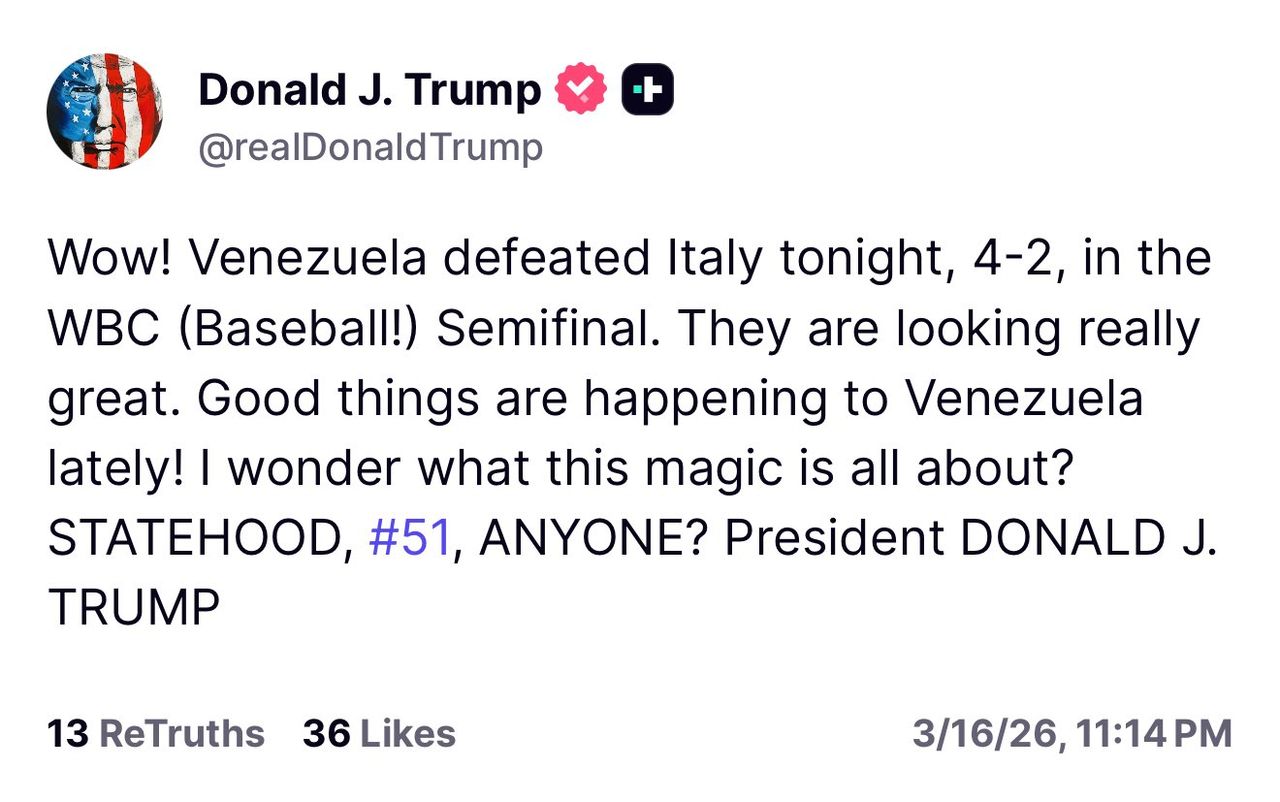 On 18 March 2026, attention immediately shifted from the baseball victory when U.S. President Donald Trump posted a provocative message questioning the annexation of Venezuela as a new American state following the World Baseball Classic (WBC) semifinal game.
