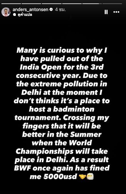 Antonsen posted on his personal Instagram: “Many have wondered why I have withdrawn from the India Open for the third year in a row. The reason is the severe air pollution problem currently in Delhi. I don’t believe this is a suitable location for holding a badminton tournament at all.”