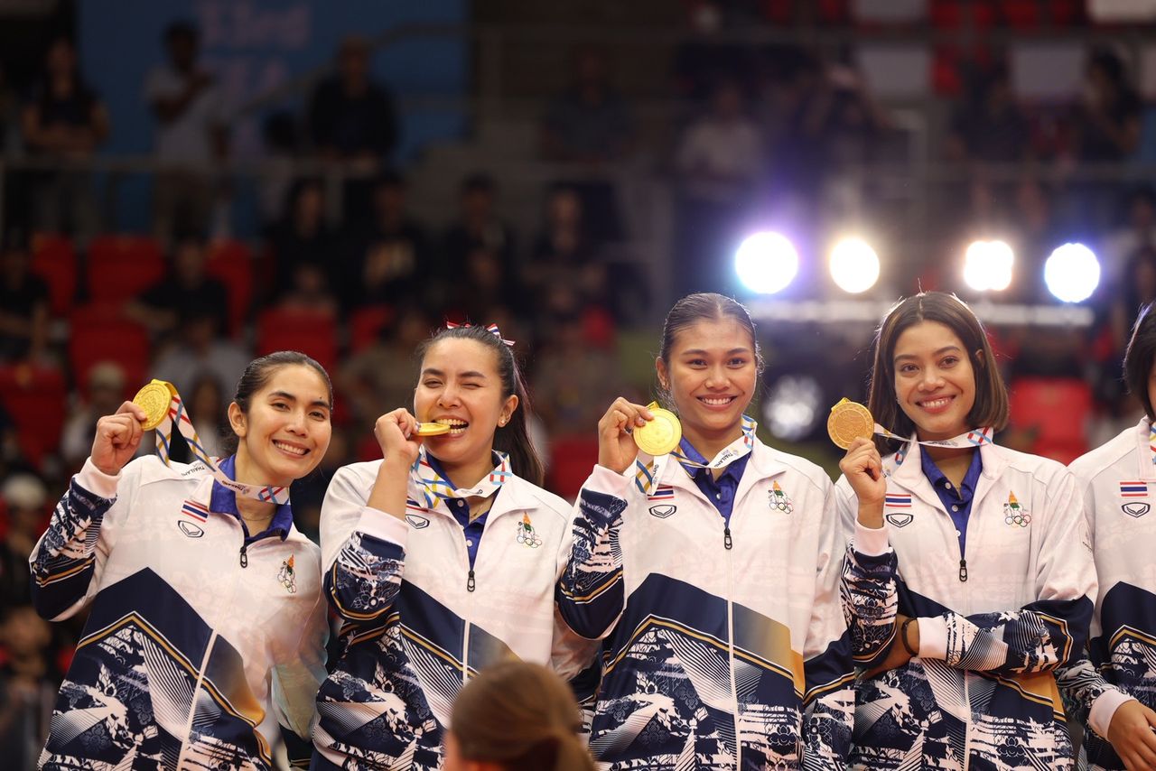 Proud moments captured! The Thai women's volleyball team joyfully receives the gold medal at the 2025 SEA Games, concluding a dramatic five-set battle. They celebrate the thrilling conclusion of this intense match.